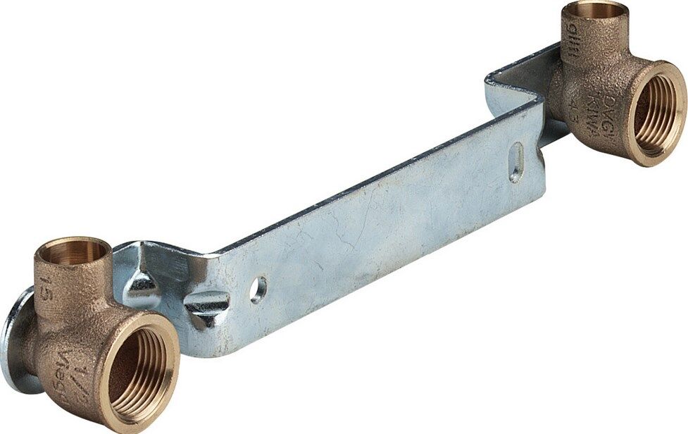 Gemini-Montageeinheit für Kupferrohrinstallation mit gekröpfter Wandhalterung, beiderseitig kurze Rotgusswinkel für Lötanschluss Ausführung 15mm x 1/2″