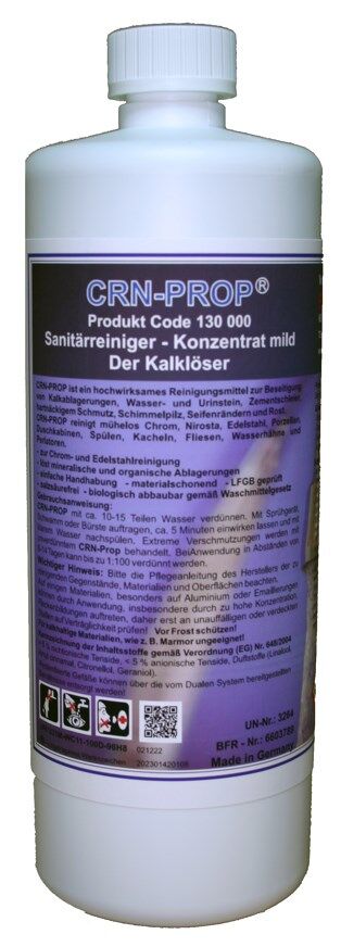 Silpats Sanitärreiniger “CRN-PROP” ist ein hochwirksames Reinigungsmittel zur Beseitigung von Kalkablagerungen, Wasser und Urinstein, hartnäckigem Schmutz und Schimmelpilz. Auch unangenehme Gerüche sowie Rost, Seifenreste und Zementschleier gehören mit “CRN-PROP” der Vergangenheit an. Der hochkonzentrierte Reiniger mit zudem noch angenehmer Duftnote verleiht Ihrem gesamten Sanitärbereich eine optisch einwandfreie Hygiene.