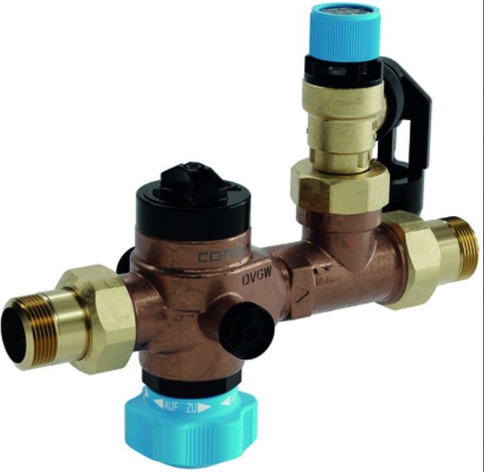 Die Conel Stream Sicherheitsgruppe dient dem optimalen Schutz vor Drucküberschreitung in geschlossenen Trinkwassererwärmern. Der Rückflußverhinderer unterbindet das Rückfließen des erwärmten Trinkwassers und das Sicherheitsventil schützt den nachgeschalteten Trinkwassererwärmer. Das leicht austauschbare Membran-Sicherheitsventil mit verschleißfestem Edelstahlsitz ist zur Anpassung an unterschiedliche Einbauverhältnisse durch einen Verschraubungsanschluss um 360° drehbar.