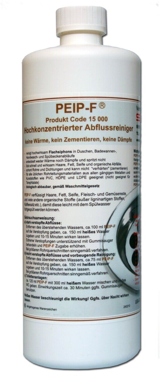 Mit dem hochkonzentrierten Silpat Abflussreiniger und Rohrreiniger “Peip-F” gehören verstopfte und stark verschmutzte Abflüsse der Vergangenheit an! Der flüssige und hochaktive Reiniger überzeugt durch seine äußerst schnelle Wirksamkeit und verflüssigt Haare, Fette, Seifen sowie Fleisch, Gemüsereste und weitere organische Stoffe (Ausnahme ligninartige Stoffe). Diese können nach Anwendung sehr einfach mit dem Spülwasser weggespült werden. Eine besonders hervorzuhebende Wirkung erzielt der Reiniger bei der Anwendung im Flachsiphon. Die dort entstandenen Pfropfen werden in Rekordzeit mühelos beseitigt.